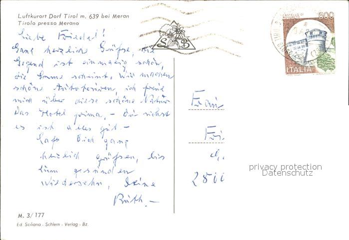old postcard Dorf Tirol Kirche Burg Blick Meran postalisch gelaufen Erhaltung siehe scans