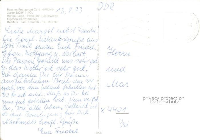 old postcard Dorf Tirol Pension Restaurant Krone postalisch gelaufen Erhaltung siehe scans