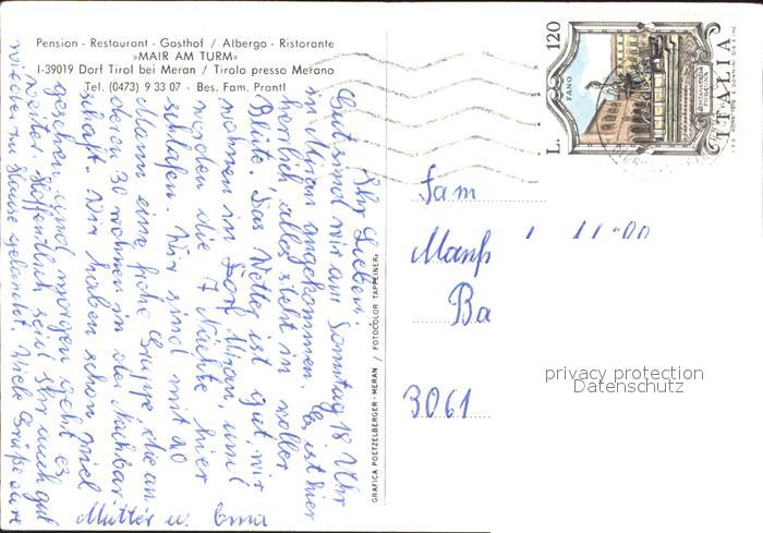 old postcard Dorf Tirol Pension Restaurant Mair am Turm postalisch gelaufen Erhaltung siehe scans