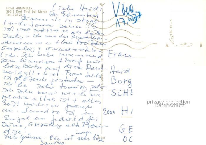 old postcard Dorf-Tirol Suedtirol IT Hotel Rimmele postalisch gelaufen Erhaltung siehe scans [WerneD78]