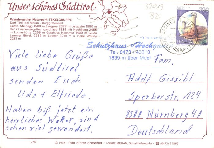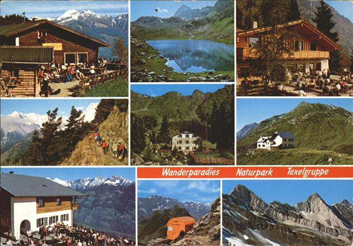 old postcard Dorf Tirol Wanderparadies Naturpark Texelgruppe Berghuette Gasthof Bergsee postalisch gelaufen Erhaltung siehe scans