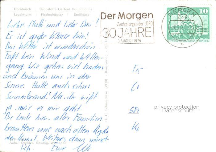72159219 alte Postkarte Dornbusch Hiddensee Grabstaette Gerhart Hauptmanns Leuchtturm Fischerhaeuser Steilkueste postalisch gelaufen Erhaltung siehe scans KatCode: 11110013061017
