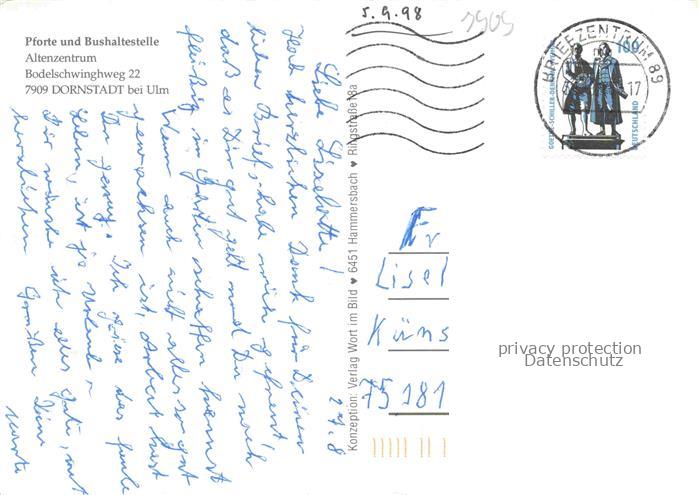 74049873 alte Postkarte Dornstadt Wuerttemberg Ulm Altenzentrum Pforte und Bushaltestelle postalisch gelaufen Erhaltung siehe scans [FriedD77] KatCode: 11110008425031
