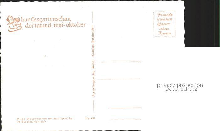 72146429 alte Postkarte DORTMUND CITY Bundesgartenschau Wasserfahnen am Musikpavillon im Buschmuehlenteich postalisch gelaufen Erhaltung siehe scans KatCode: 11110005913000