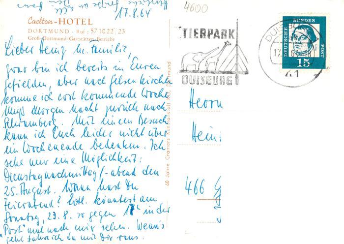 73892986 DORTMUND CITY Carlton Hotel Bar postalisch gelaufen Erhaltung siehe scans [WerneD78] alte Postkarte Wern Katcode 11110005913000