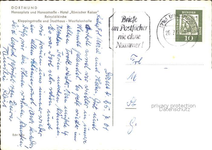 71913445 alte Postkarte DORTMUND CITY Hansaplatz und Hansastr Hotel Roemischer Kaiser Reinoldikirche Stadthaus Westfalenhalle postalisch gelaufen KatCode: 11110005913000