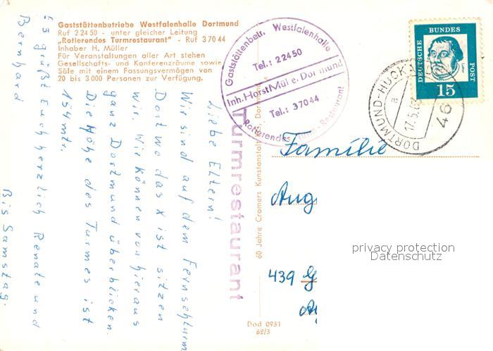 73048227 alte Postkarte DORTMUND CITY Rosenterrasse Fernmeldeturm Rotierendes Turmrestaurant Westfalenhalle postalisch gelaufen Erhaltung siehe scans [WerneD78] KatCode: 11110005913000