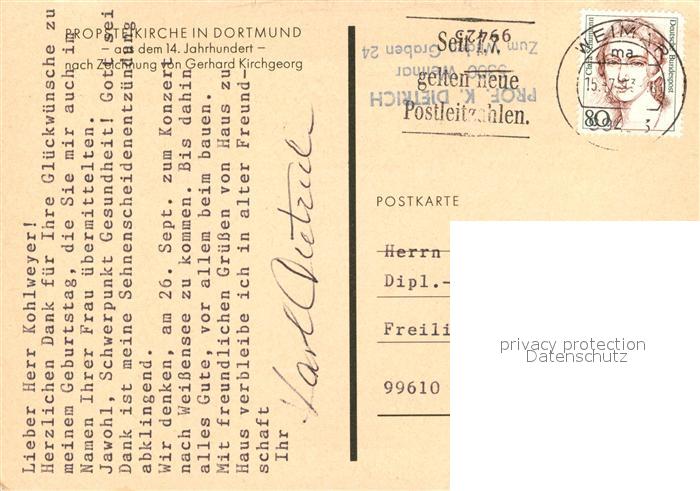73572216 alte Postkarte Dortmund Propsteikirche 14. Jhdt. Zeichnung von Gerhard Kirchgeorg Kuenstlerkarte postalisch gelaufen Erhaltung siehe scans [FriedD77] KatCode: 11110005913000