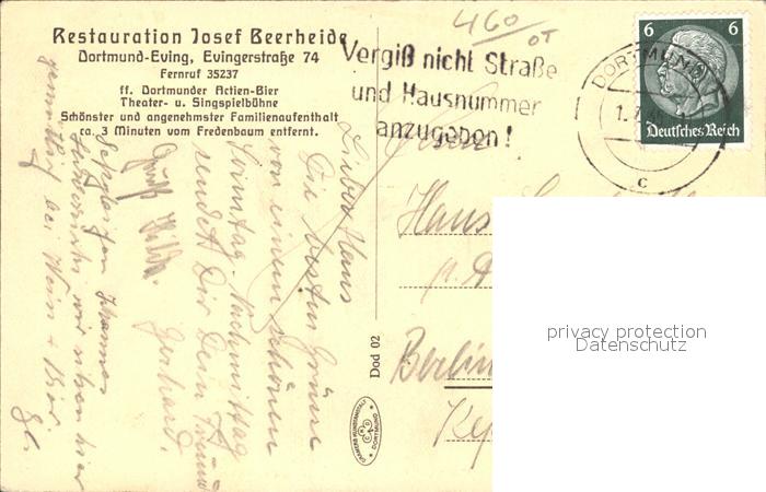 32209547 alte Postkarte Dortmund Restauration Josef Beerheide postalisch gelaufen Erhaltung siehe scans KatCode: 11110005913000