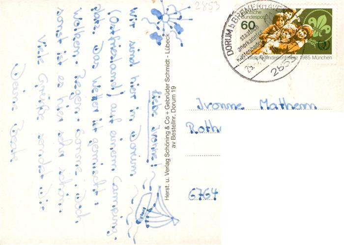 73933377 Dorum Nordseebad Freibad Kirche Yachthafen Kutterhafen Schafe Deich Ortsmitte Sonnenuntergang Hafenidyll postalisch gelaufen Erhaltung siehe scans [FriedD77] alte Postkarte Frie Katcode 11110003352012