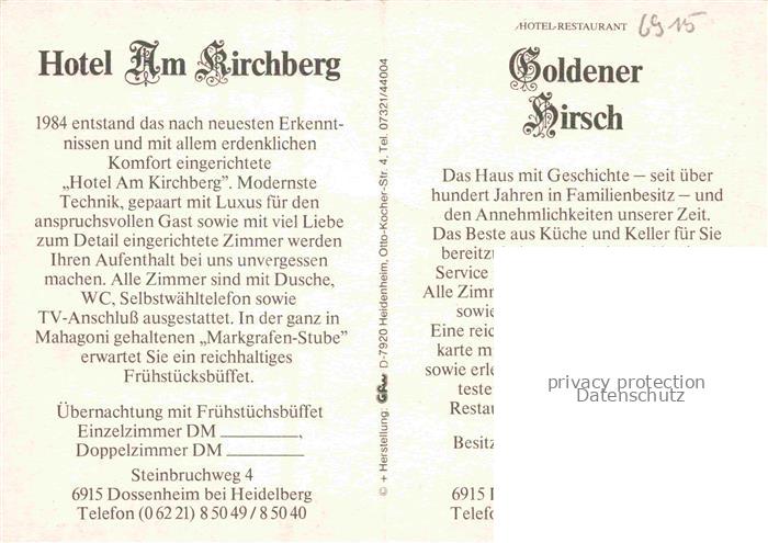 74048973 Dossenheim Heidelberg Hotel Restaurant Goldener Hirsch Hotel Am Kirchberg Gastraeume postalisch nicht gelaufen Werbekarte (keine Postkarte) Erhaltung siehe scans [WerneD78] KatCode: 11110008226012