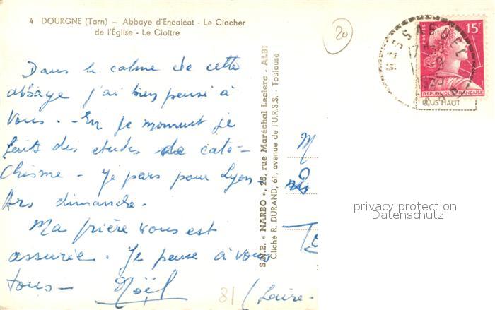 13485512 carte postale Dourgne Abbaye d Encalcat Clocher de l’Eglise Le Cloitre postalisch gelaufen Erhaltung siehe scans [FriedD77] KatCode: 11170081281081