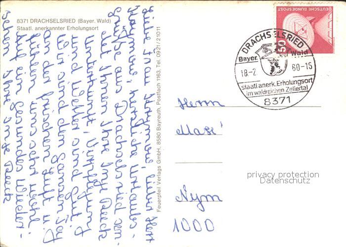 72064760 alte Postkarte Drachselsried Panorama Strassenpartien Wegekreuz Pferdepflug Kirche postalisch gelaufen Erhaltung siehe scans KatCode: 11110009276120