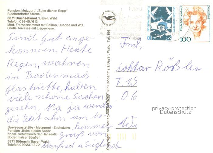 73663989 alte Postkarte Drachselsried Pension Metzgerei Zum dicken Sepp Gaststaette postalisch gelaufen Erhaltung siehe scans [FriedD77] KatCode: 11110009276120