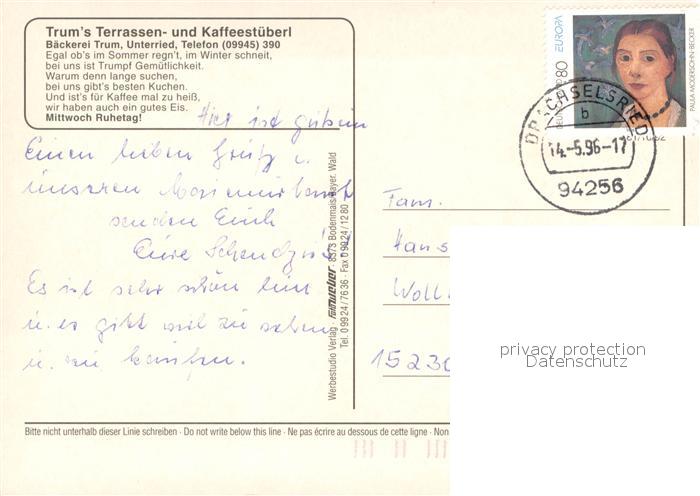 73668626 alte Postkarte Drachselsried Unterried Trums Terrassen Kaffeest?berl postalisch gelaufen Erhaltung siehe scans [LiesaD40] KatCode: 11110009276120
