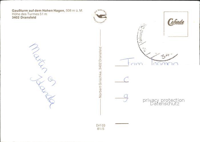 72414386 alte Postkarte Dransfeld Gaussturm auf dem Hohen Hagen Dorfpartie Teilansicht Schwimmbad postalisch gelaufen Erhaltung siehe scans KatCode: 11110003152006