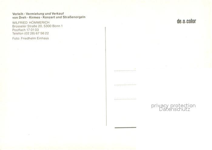 73140400 Drehorgel Leierkasten Barrel Organ– Verleih-Vermietung und Verlauf Wilfried Hoemmerich Bonn postalisch nicht gelaufen Erhaltung siehe scans [PaolaD17] Paol Katcode 22560000002000