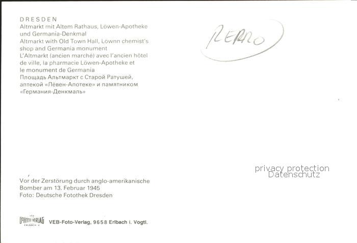 72314136 DRESDEN Elbe Altmarkt Altes Rathaus Loewenapotheke Germaniadenkmal vor Zerstoerung 1945 postalisch nicht gelaufen Erhaltung siehe scans KatCode: 11110014262000