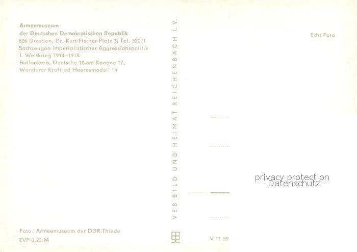 73722409 DRESDEN Elbe Armeemuseum der DDR Sachzeugen aus WK1 Ballonkorb Dt 10 cm Kanone 17 Wanderer Kraftrad Heeresmodell 14 postalisch nicht gelaufen Erhaltung siehe scans [WerneD78] Wern Katcode 11110014262000