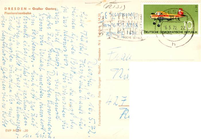 73871466 Dresden Elbe Bahnhof Frohe Zukunft Pioniereisenbahn Grosser Garten postalisch gelaufen Erhaltung siehe scans [WerneD78] alte Postkarte Wern Katcode 11110014262000