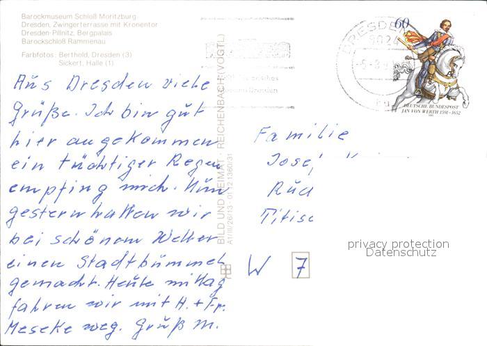 72352204 alte Postkarte DRESDEN Elbe Barockmuseum Schloss Moritzburg Zwingerterrasse Kronentor postalisch gelaufen Erhaltung siehe scans KatCode: 11110014262000