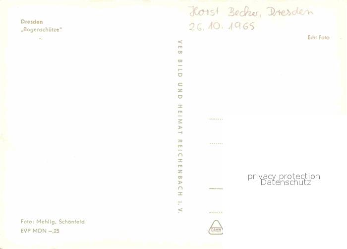 72872498 DRESDEN Elbe Bogenschuetze Statue an der Elbe postalisch nicht gelaufen Erhaltung siehe scans [FriedD77] KatCode: 11110014262000