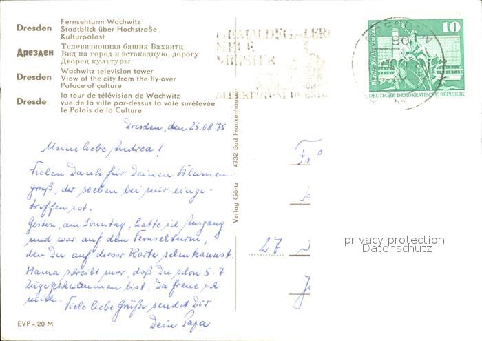72316933 alte Postkarte DRESDEN Elbe Fernsehturm Wachwitz Stadtblick Hochstrasse Kulturpalast postalisch gelaufen Erhaltung siehe scans KatCode: 11110014262000