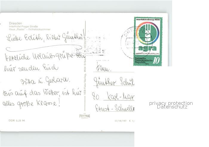 72017152 alte Postkarte DRESDEN Elbe Interhotel Prager Strasse Haus Bastei Fruehstueckszimmer postalisch gelaufen Erhaltung siehe scans KatCode: 11110014262000