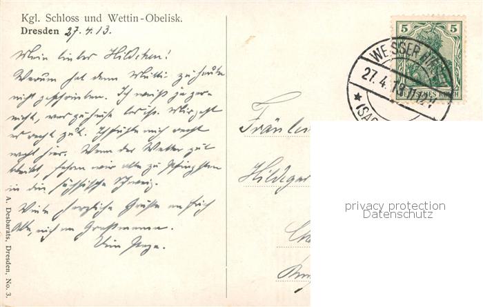 73807346 Dresden Elbe Kgl Schloss und Wettin Obelisk postalisch gelaufen Erhaltung siehe scans [WerneD78] alte Postkarte Wern Katcode 11110014262000