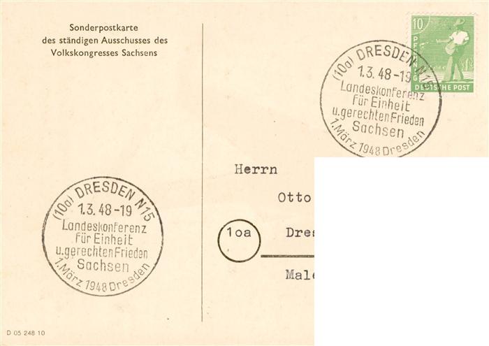 73873409 Dresden Elbe Landeskonferenz fuer Deutschlands Einheit und gerechten Frieden Sonderpostkarte Sonderstempel postalisch gelaufen Erhaltung siehe scans [FriedD77] alte Postkarte Frie Katcode 11110014262000