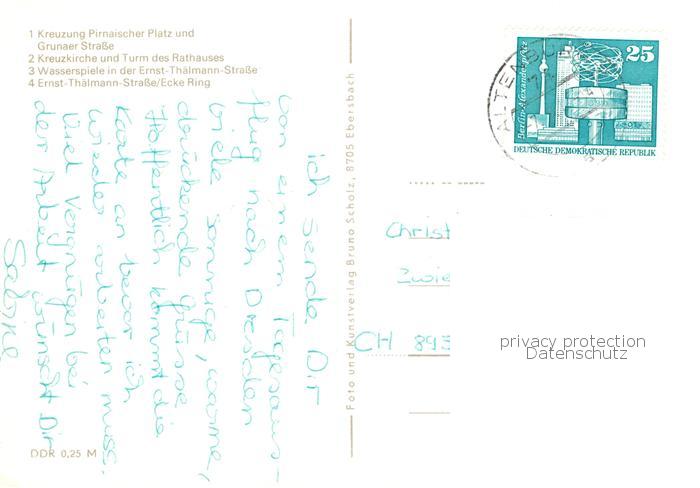 73835594 Dresden Elbe Pirnaischer Platz und Grunaer Strasse Kreuzkirche Turm des Rathauses Wasserspiele Thaelmann Strasse Ecke Ring postalisch gelaufen Erhaltung siehe scans [WerneD78] alte Postkarte Wern Katcode 11110014262000