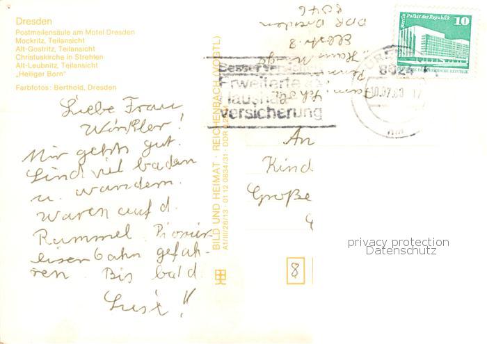 73832902 Dresden Elbe Postmeilensaeule Mockritz Alt Gostritz Christuskirche Strehlen Alt Leubnitz Teilansicht Heiliger Born postalisch gelaufen Erhaltung siehe scans [FriedD77] alte Postkarte Frie Katcode 11110014262000