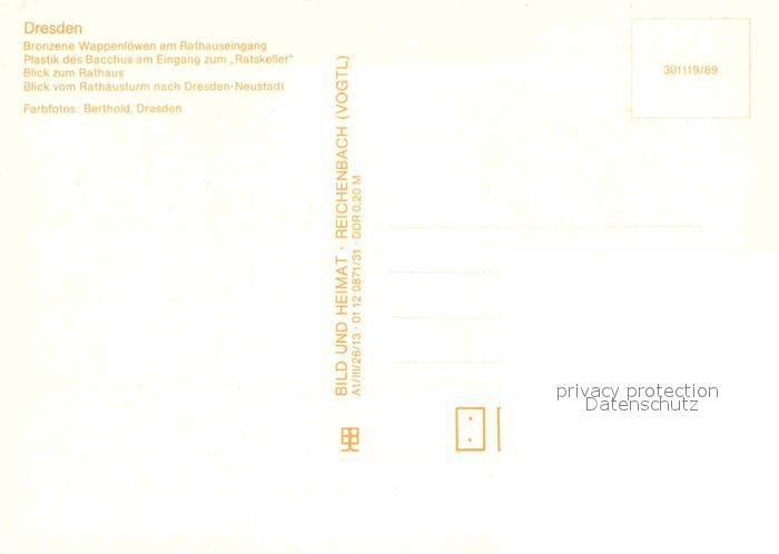 72629239 DRESDEN Elbe Rathaus Eingang Wappenloewen Bacchus Plastik Ratskeller Rathaus Rathausturm postalisch nicht gelaufen Erhaltung siehe scans [WerneD78] KatCode: 11110014262000