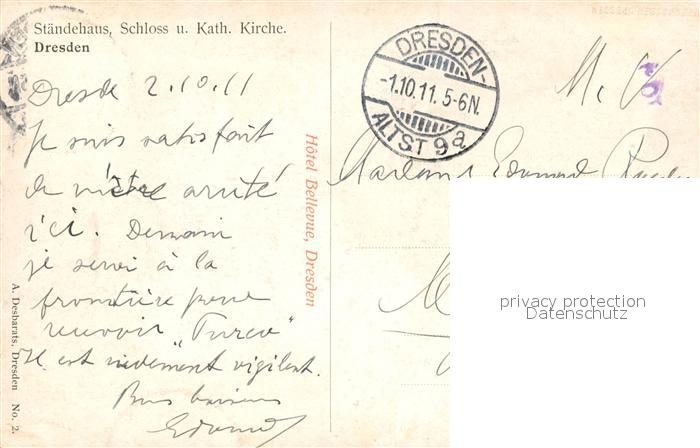 33604355 alte Postkarte DRESDEN Elbe Staendehaus Schloss und Kath Kirche postalisch gelaufen Erhaltung siehe scans [WerneD78] KatCode: 11110014262000