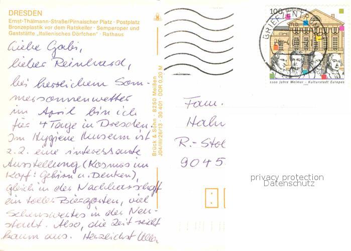 72891161 alte Postkarte DRESDEN Elbe Thaelmann Str Pirnaischer Platz Bronzeplastik Semperoper Gaststaette Ital Doerfchen postalisch gelaufen Erhaltung siehe scans [WerneD78] KatCode: 11110014262000
