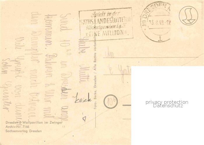 72821498 alte Postkarte DRESDEN Elbe Wallpavillon im Zwinger postalisch gelaufen Erhaltung siehe scans [AndreD76] KatCode: 11110014262000