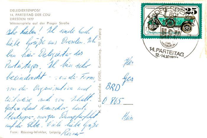 73897472 Dresden Elbe Wasserspiele Prager Strasse Delegiertenpost 14. Parteitag der CDU postalisch gelaufen Erhaltung siehe scans [FriedD77] alte Postkarte Frie Katcode 11110014262000