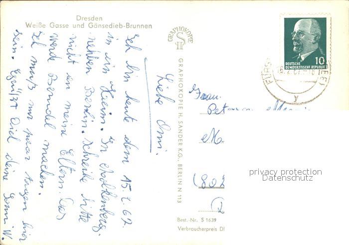 72508765 alte Postkarte DRESDEN Elbe Weisse Gasse Gaensediebbrunnen postalisch gelaufen Erhaltung siehe scans KatCode: 11110014262000