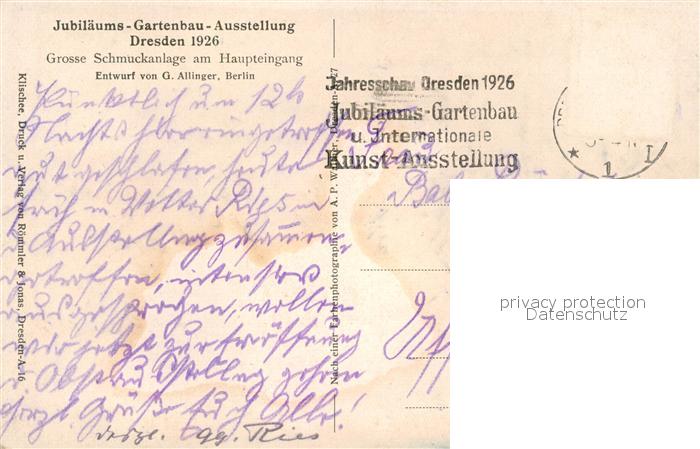 73585145 alte Postkarte Dresden Jubilaeums Gartenbau Ausstellung Schmuckanlage am Haupteingang Blumenbeete postalisch gelaufen Erhaltung siehe scans [FriedD77] KatCode: 11110014262000