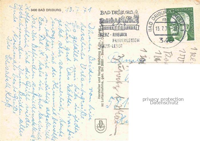 74156674 alte Postkarte Driburg BAD DRIBURG Stadtkirche Teutoburger-Wald Huegel Denkmal Daecher Altstadt Kurort Stadtansicht postalisch gelaufen Fliegeraufnahme Erhaltung siehe scans [Karloger] KatCode: 11110005762004