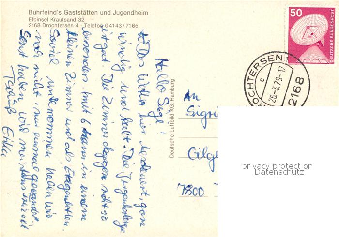73127340 alte Postkarte Drochtersen Buhrfeind s Gaststaetten und Jugendheim Park Gartenterrasse Blumenbeete Tulpen postalisch gelaufen Erhaltung siehe scans [FriedD77] KatCode: 11110003359013