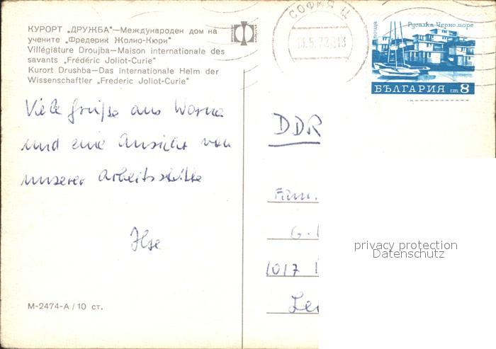 old postcard Drushba Bulgarien Internationales Heim der Wissenschaftler Frederic Joliot Curie Hotelhalle Strandpartie postalisch gelaufen Erhaltung siehe scans