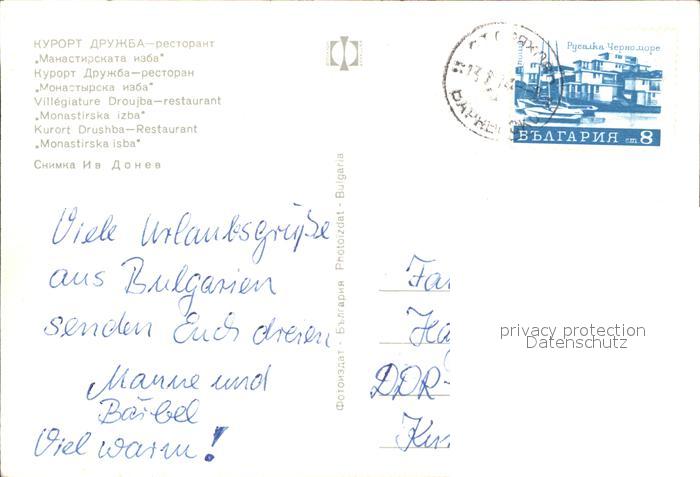 old postcard Drushba Bulgarien Restaurant Monastirska isba postalisch gelaufen Erhaltung siehe scans