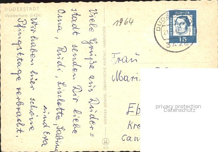 72114208 alte Postkarte Duderstadt Niedersachsen Westerturm postalisch gelaufen Erhaltung siehe scans KatCode: 11110003152007