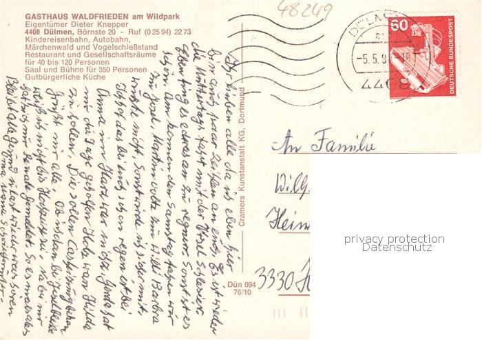 73866839 alte Postkarte Duelmen Gasthaus Restaurant Waldfrieden am Wildpark postalisch gelaufen Erhaltung siehe scans [FriedD77] KatCode: 11110005558016