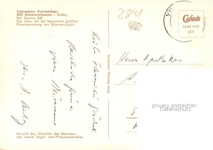 73723964 alte Postkarte Duemmerlohausen Pensionshaus Ausschnitt aus der Vogelsammlung Seeblick Bauernhaus mit Storchennest postalisch gelaufen Erhaltung siehe scans [WerneD78] KatCode: 11110003460002