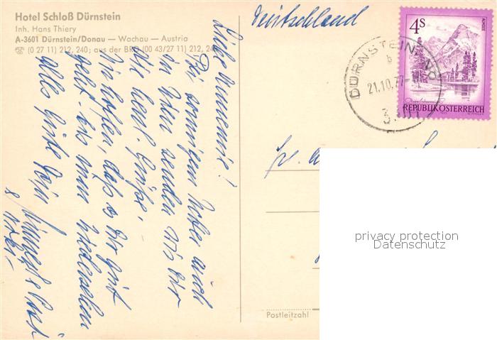 73250029 alte Postkarte Duernstein Wachau Blick ueber die Donau Hotel Schloss Duernstein postalisch gelaufen Erhaltung siehe scans [FriedD77] KatCode: 11390124031304