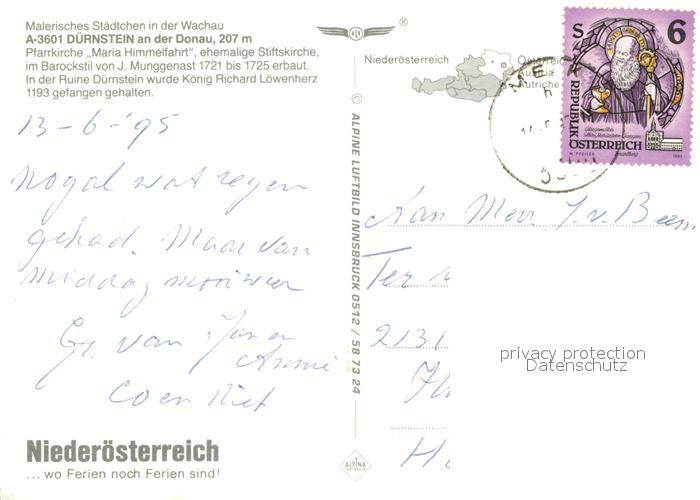 73049141 alte Postkarte Duernstein Wachau Fliegeraufnahme Pfarrkirche Maria Himmelfahrt postalisch gelaufen Erhaltung siehe scans [KathaD81] KatCode: 11390124031304