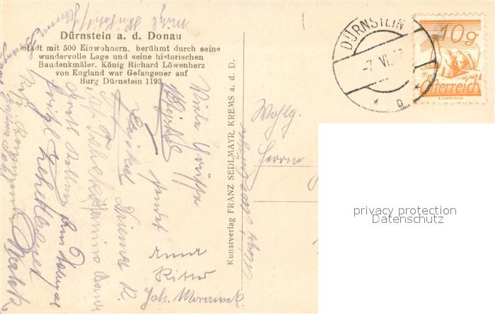 43093297 alte Postkarte Duernstein Wachau Teilansicht mit Burg postalisch gelaufen Erhaltung siehe scans [WerneD78] KatCode: 11390124031304