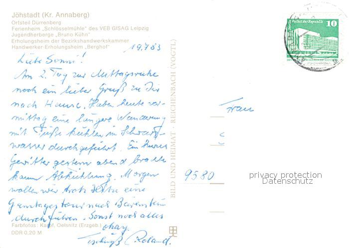 73041066 alte Postkarte Duerrenberg Joehstadt Ferienheim Schloesselmuehle Jugendherberge Bruno Kuhn Erholungsheim der Bezirkshandwerkskammer Handwerker Erholungsheim Berghof postalisch gelaufen Erhaltung siehe scans [WerneD78] KatCode: 11110014171190